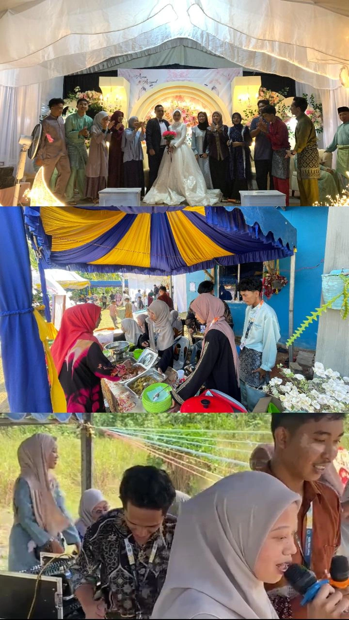 Tidak hanya berperan dalam pekerjaan teknis, mahasiswa KKN juga turut memeriahkan suasana dengan menyumbangkan bakat bernyanyi. Hiburan tersebut menjadi salah satu momen yang disambut hangat oleh mempelai dan para tamu undangan, menambah semarak suasana perayaan.
