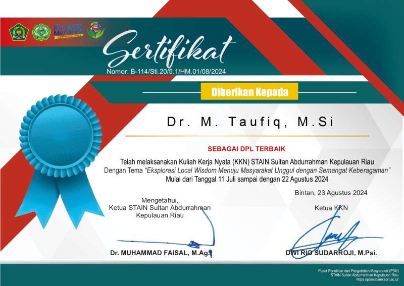 Bintan, Kampus Bersendikan Wahyu Berteraskan Ilmu — Sekolah Tinggi Agama Islam Negeri (STAIN) Sultan Abdurrahman Kepulauan Riau menggelar acara penutupan Kuliah Kerja Nyata (KKN) Reguler 2024 yang berlangsung di Halaman Gedung Kuliah Terpadu STAIN Kepri. Acara ini dihadiri oleh Ketua STAIN Kepri, Dr. Muhammad Faisal, M.Ag., yang didampingi oleh Ketua Dharma Wanita Persatuan (DWP) STAIN Kepri, panitia KKN 2024, seluruh Dosen Pembimbing Lapangan (DPL), dan mahasiswa peserta KKN.