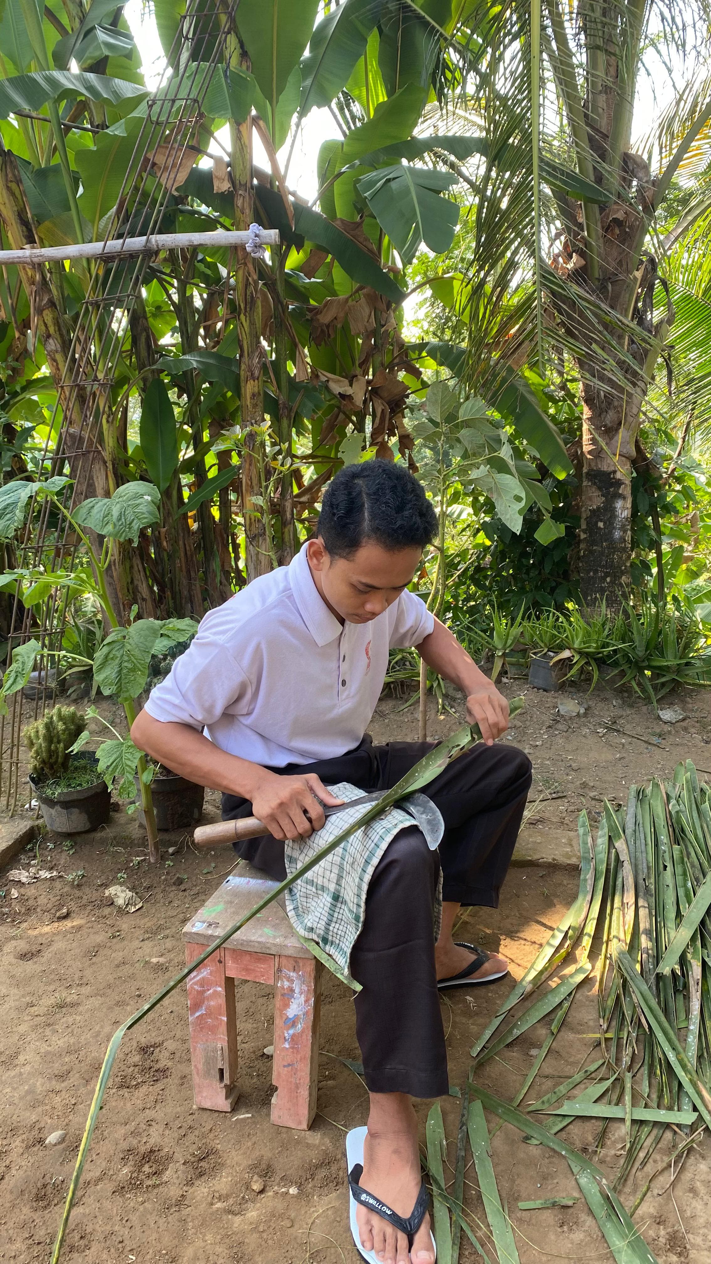 Tak ketinggalan, Abdurrahman Aziz Muafa, atau akrab disapa Abe, selaku ketua kelompok, juga menunjukkan keahliannya. Dengan bekal pisau tajam, Abe mengupas pelepah kelapa dengan penuh kehati-hatian dan kemahiran yang patut diacungi jempol. Gerakan tangannya yang presisi mencerminkan dedikasi dan pemahaman mendalam tentang teknik pengolahan tradisional ini. Kegiatan pembuatan sapu lidi ini tidak hanya menghasilkan produk fungsional, tetapi juga menjadi ajang transfer pengetahuan dan keterampilan antargenerasi, memperkuat identitas budaya Dusun Ngentak.